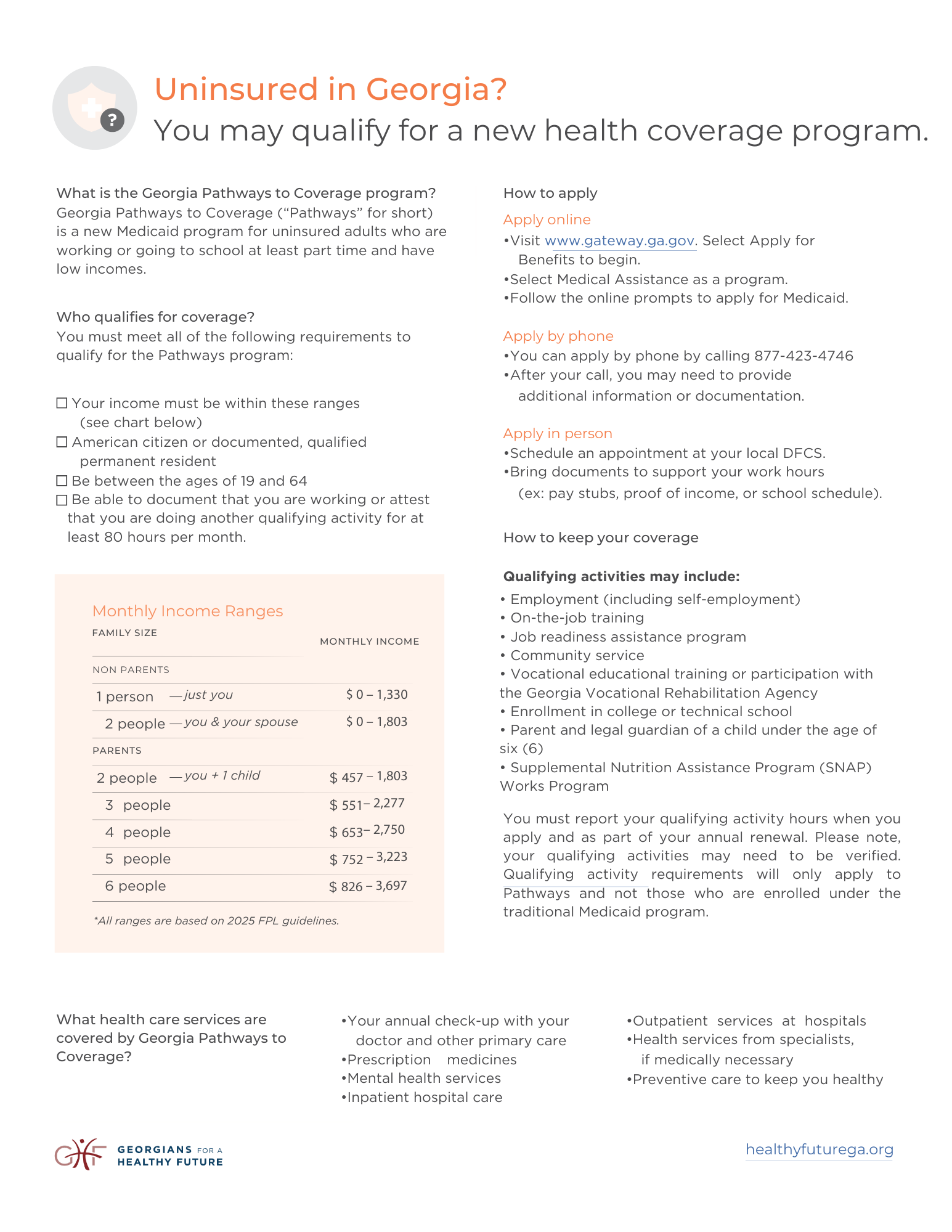 Georgia Pathways to Coverage (“Pathways” for short) is a Medicaid program for uninsured adults who are working or going to school at least part-time and have low incomes. Here is a fact sheet with details about Georgia Pathways eligibility and other information you need to know.